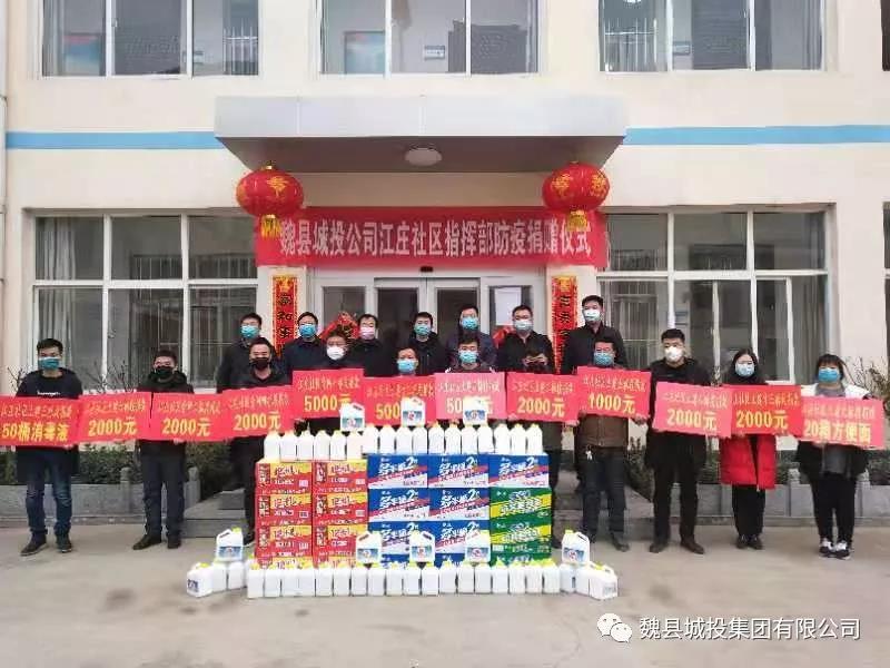 在隨后的魏縣城投公司江莊社區(qū)指揮部防疫捐贈儀式上,各標(biāo)段企業(yè)負(fù)責(zé)人共捐贈現(xiàn)金3.4萬元、消毒液50桶、方便面20箱。這些愛心企業(yè)家用行動詮釋了“重信義、敢擔(dān)當(dāng)、創(chuàng)大業(yè)、愛家鄉(xiāng)”的新時期魏縣精神。