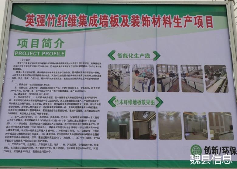 總投資1.5億元,由魏縣英強(qiáng)裝飾材料有限公司投資建設(shè)。項(xiàng)目集研發(fā)、生產(chǎn)竹木纖維集成墻板為一體,產(chǎn)品具有安裝簡單、環(huán)保零甲醛、防潮不變形等特點(diǎn),生產(chǎn)工藝行業(yè)領(lǐng)先。項(xiàng)目建成后,年銷售收入8000萬元,創(chuàng)造利潤778萬元,提供就業(yè)崗位50個(gè)。