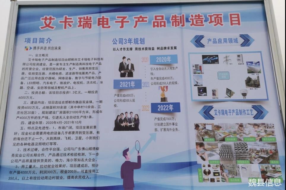 總投資1.2億元,其中一期投資6000萬元,由邯鄲市艾卡瑞電子科技有限公司投資建設(shè)。項(xiàng)目主要從事高頻變壓器、低頻變壓器、共模電感、濾波器等線圈類高科技產(chǎn)品研發(fā)、生產(chǎn)、銷售,具有市場廣闊、發(fā)展前景好、生產(chǎn)技術(shù)先進(jìn)等特點(diǎn)。項(xiàng)目建成后,年產(chǎn)值4000萬元,提供就業(yè)崗位350個(gè)。