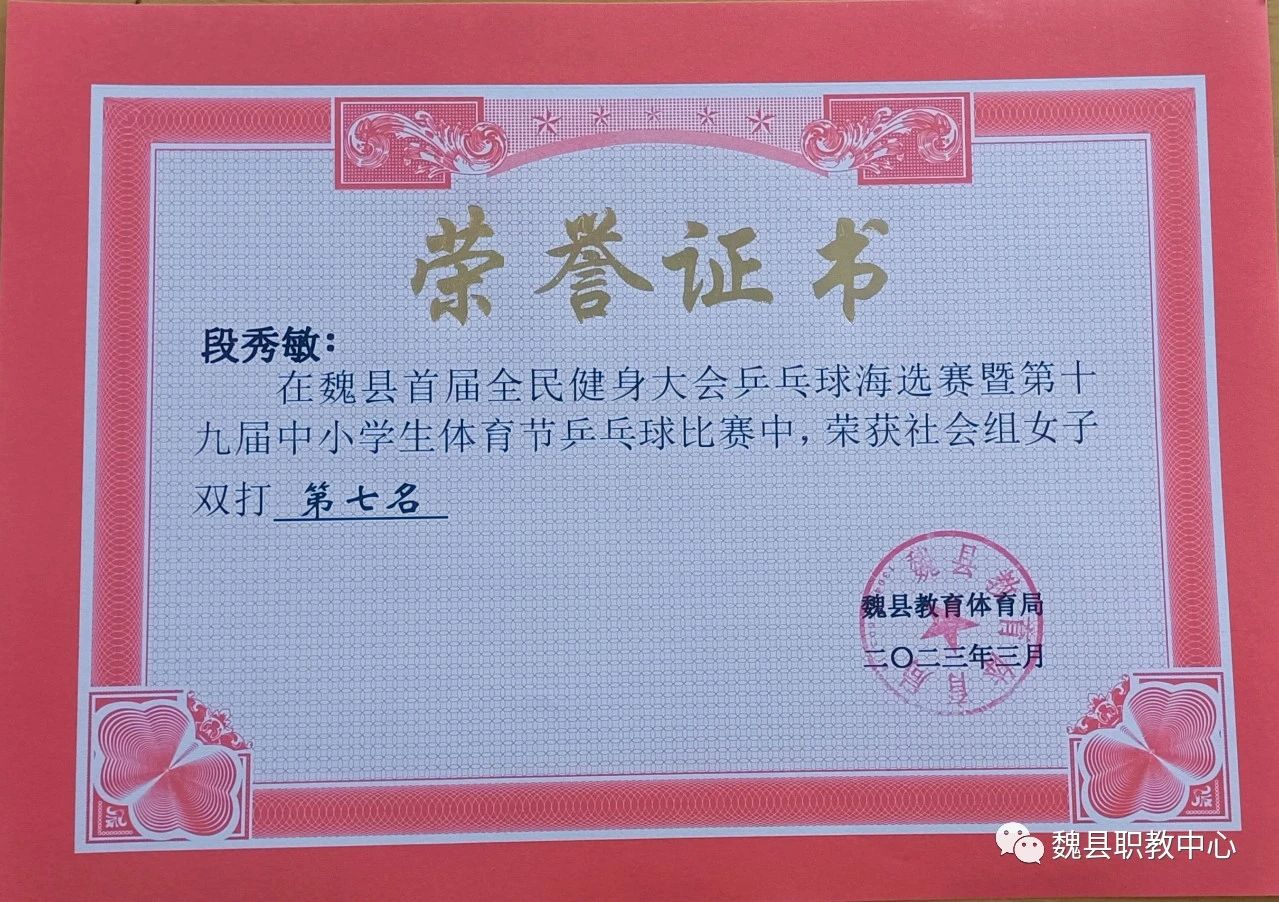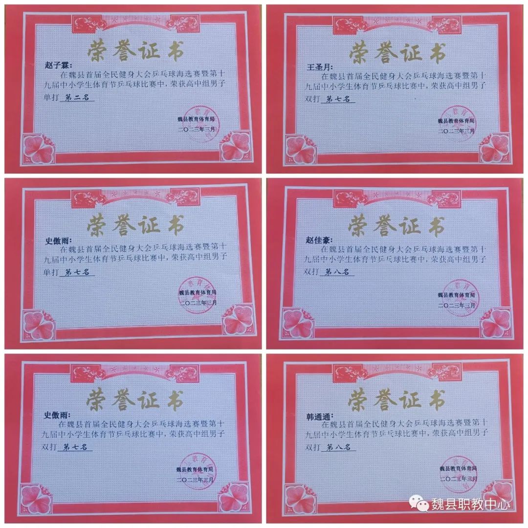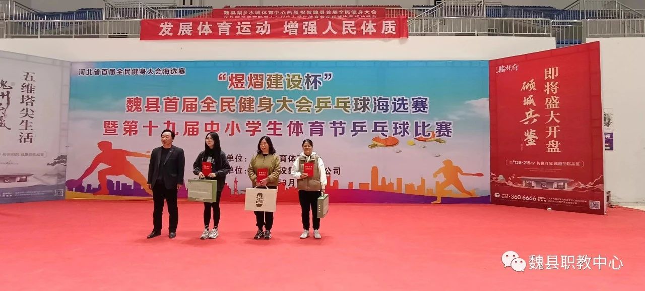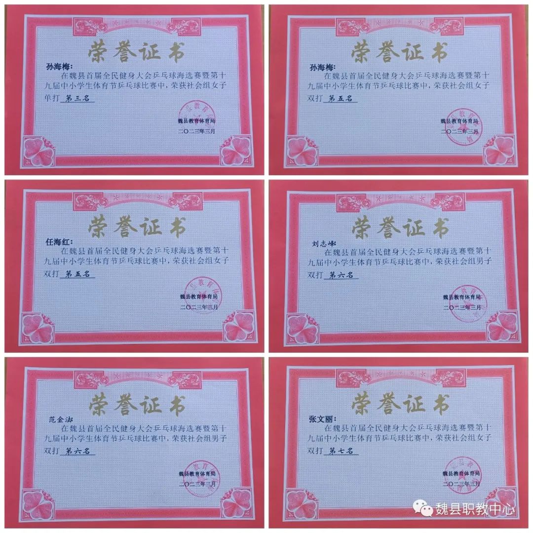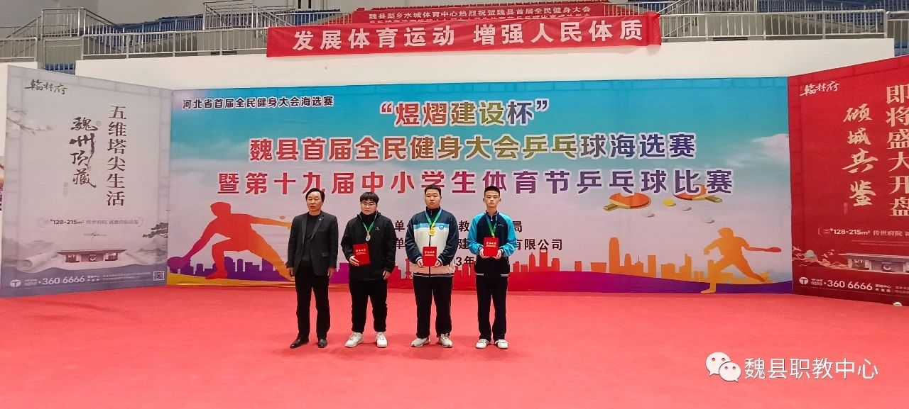3月26日至27日,在縣體育中心舉行的魏縣首屆全民健身乒乓球海選賽暨第十九屆中小學體育節(jié)乒乓球比賽中,魏縣職教中心多名師生經(jīng)過激烈比拼,榮獲優(yōu)異成績,其中,高中組學生趙子霖榮獲男子單打第二名,史傲雨榮獲男子單打第七名,王圣月、史傲雨榮獲男子雙打第七名,趙佳豪、韓通通榮獲男子雙打第八名;社會組孫海梅老師榮獲女子單打第三名,孫海梅、任海紅榮獲女子雙打第五名,劉志鋒、范金法老師榮獲男子雙打第六名,段秀敏、張文麗老師榮獲女子雙打第七名;學校被授予體育優(yōu)秀組織獎。