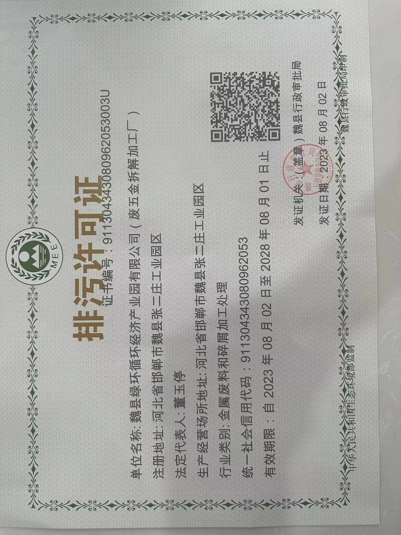 1 | 魏縣綠環(huán)循環(huán)經(jīng)濟(jì)產(chǎn)業(yè)園有限公司 | 有限責(zé)任公司 | 董玉停 | 河北省邯鄲市魏縣張二莊工業(yè)園區(qū) | 河北省邯鄲市魏縣張二莊工業(yè)園區(qū) | 1、廢五金、廢電線電纜、廢壓縮機(jī) 2、拆解廢棄的電機(jī)及其零部件、下腳料 | 13031095238 |