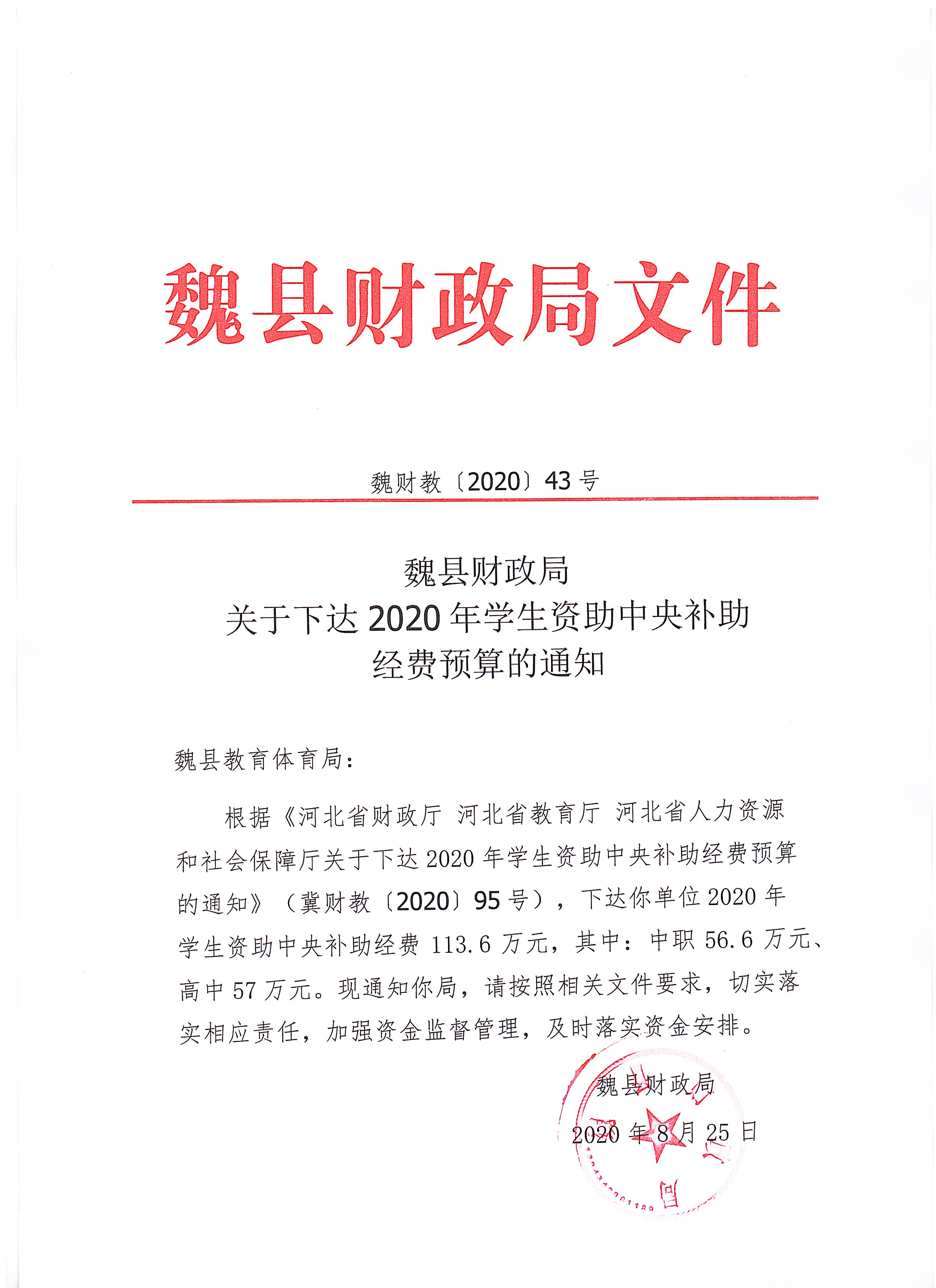 魏縣財政局關于下達2020年學生資助中央補助經費預算的通知