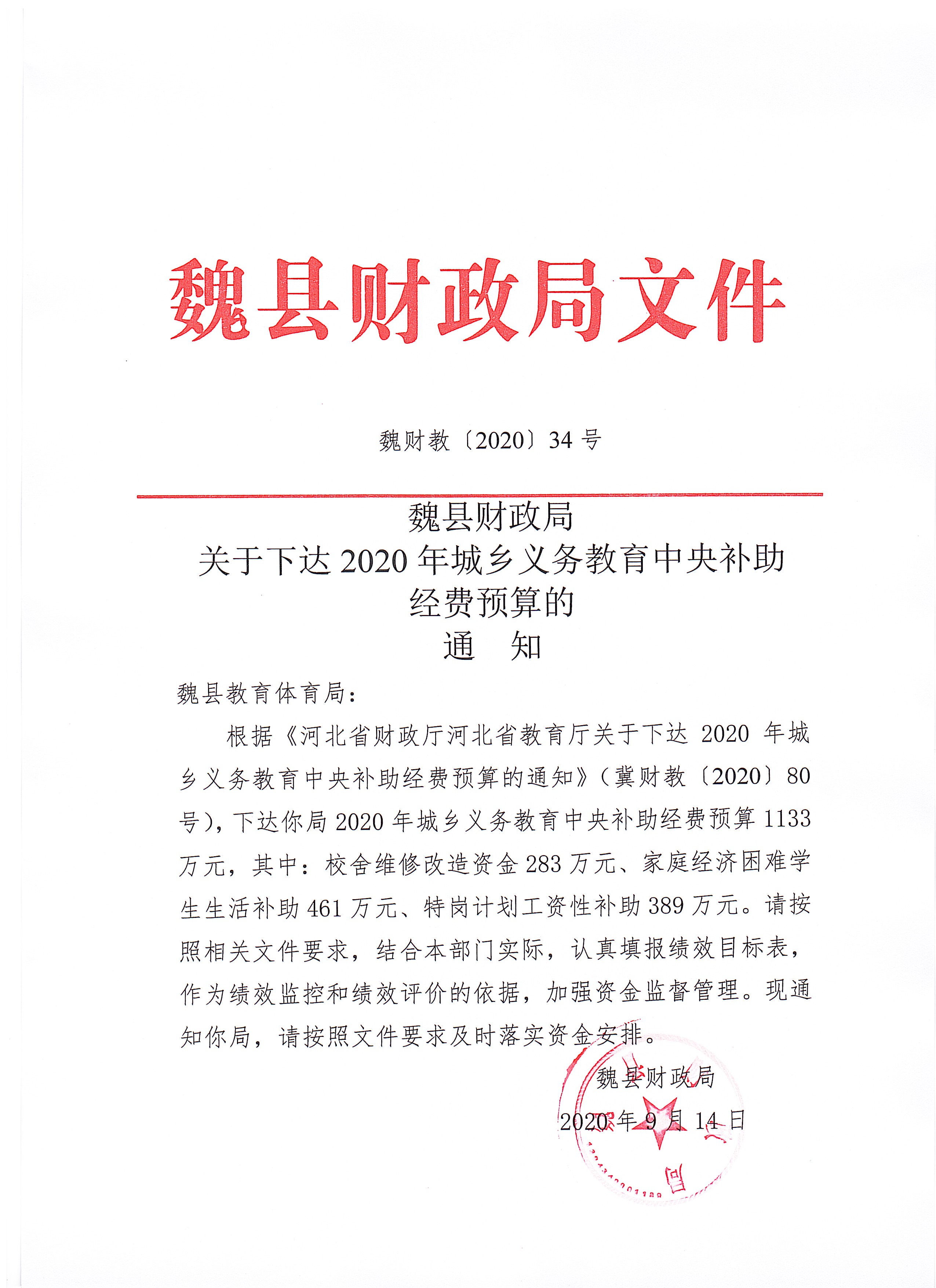 附件:魏縣財政局關于下達2020年城鄉(xiāng)義務教育中央補助經費預算的通知.jpg