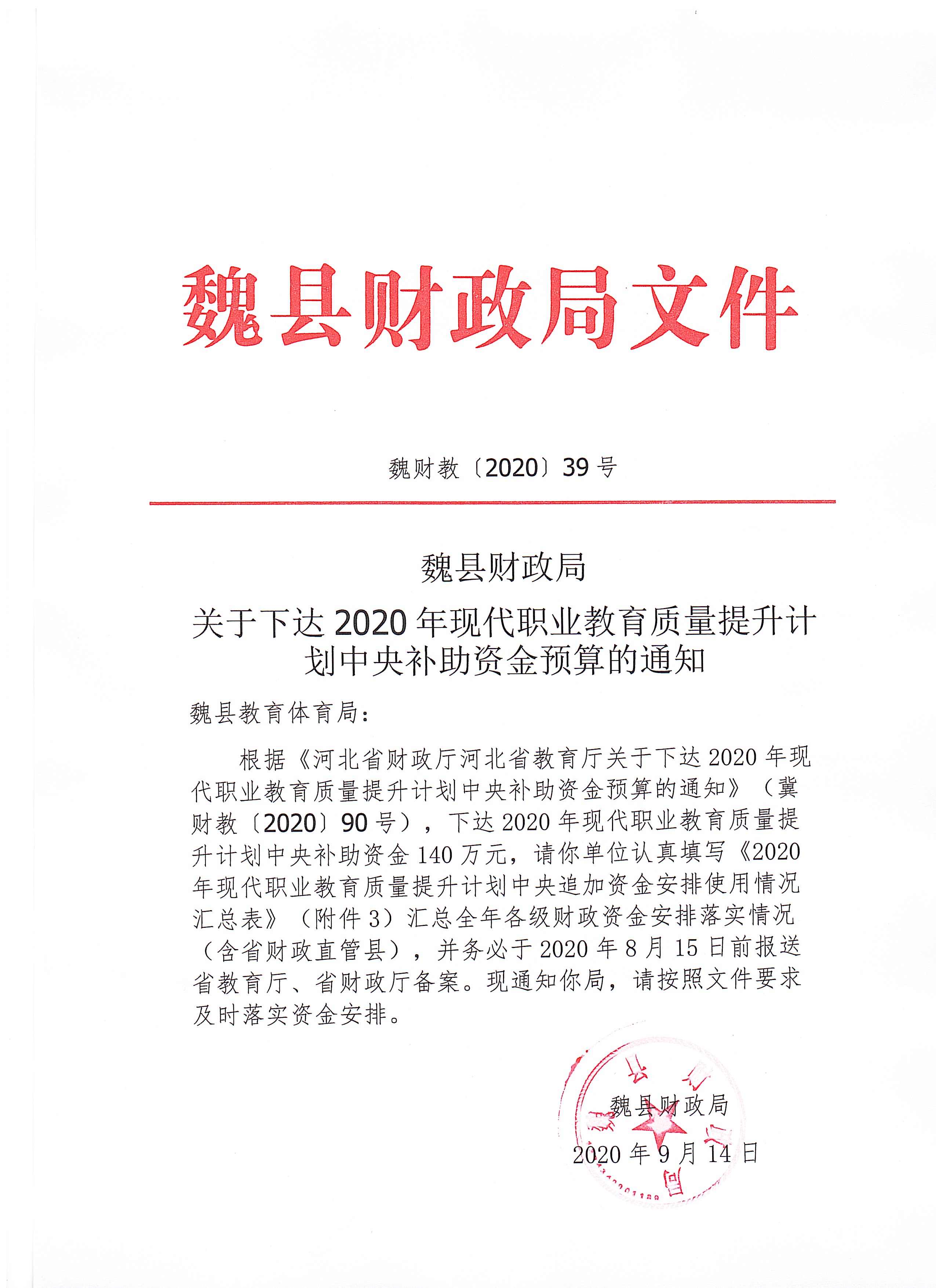 魏縣財政局關于下達2020年現(xiàn)代職業(yè)教育質量提升計劃中央補助資金預算的通知