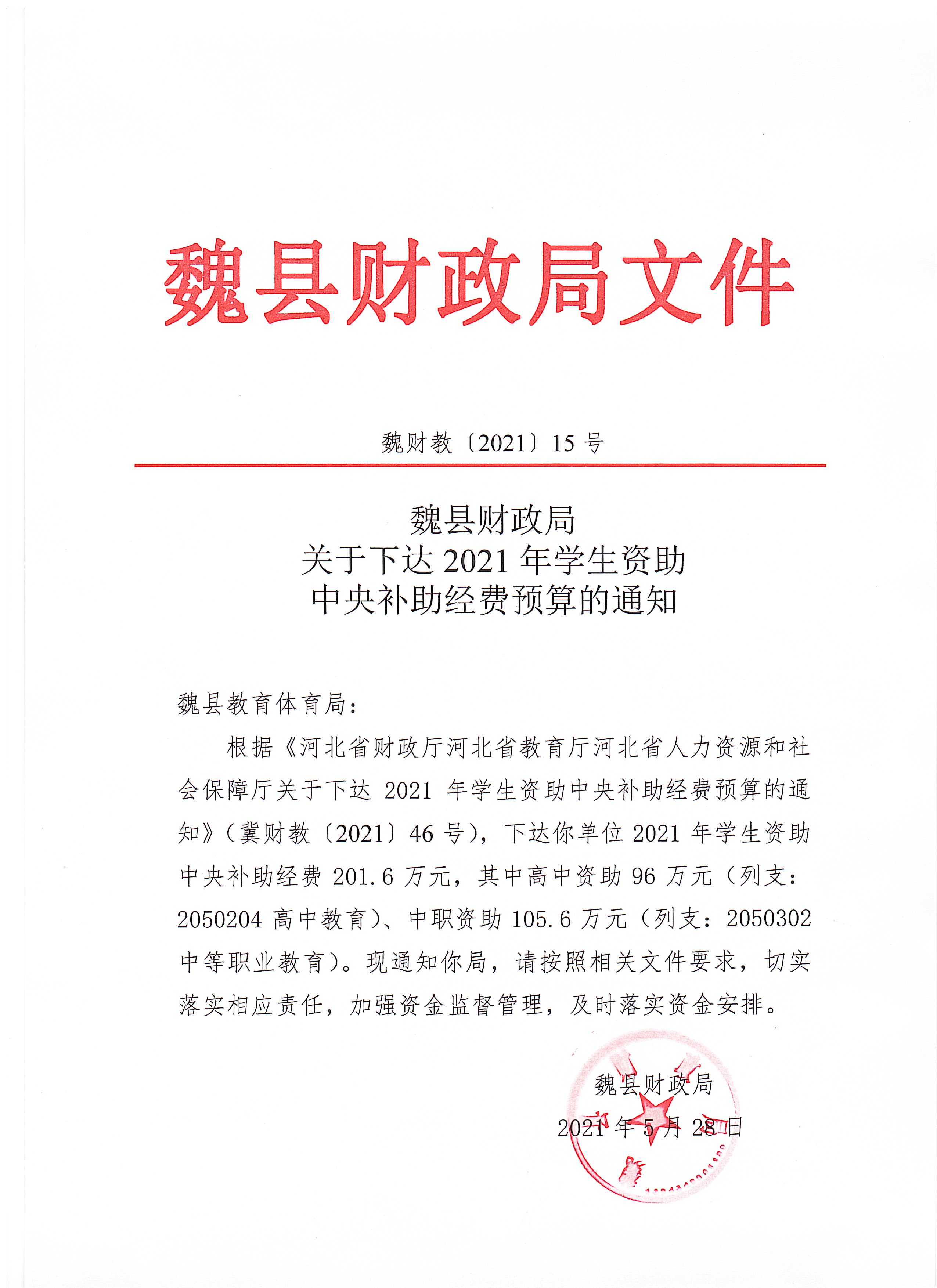 名稱:魏縣財(cái)政局關(guān)于下達(dá)2021年學(xué)生資助中央補(bǔ)助經(jīng)費(fèi)預(yù)算的通知