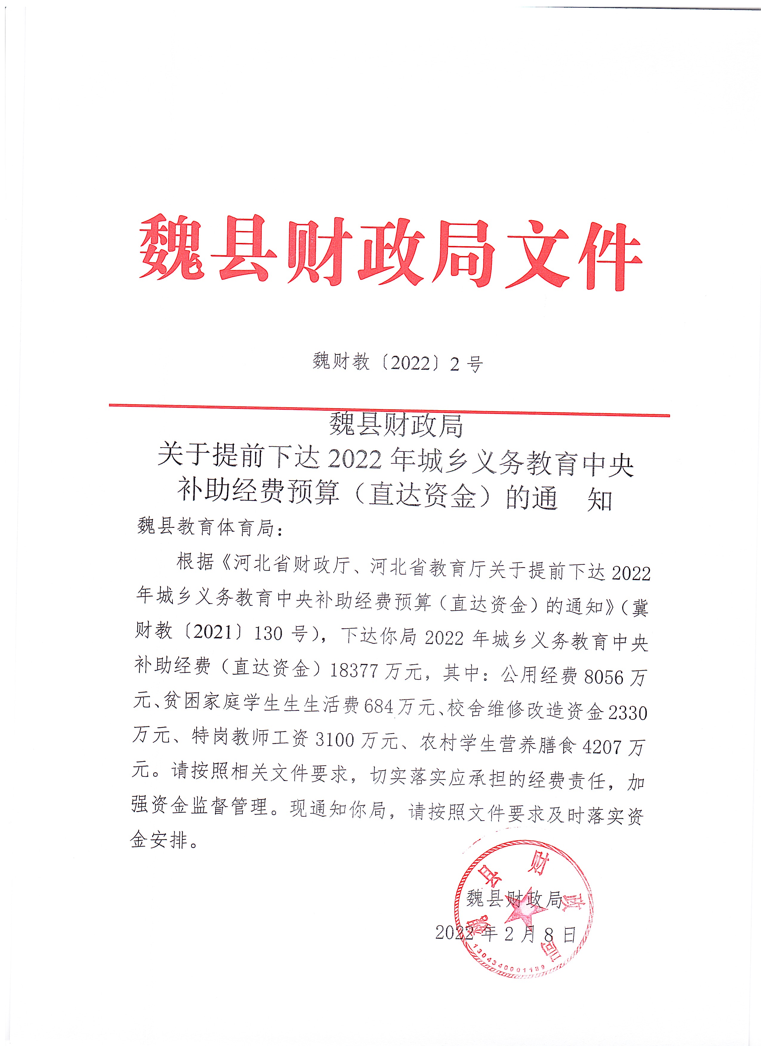 名稱:魏縣財政局關(guān)于提前下達2022年城鄉(xiāng)義務(wù)教育中央補助經(jīng)費預(yù)算(直達資金)的通知