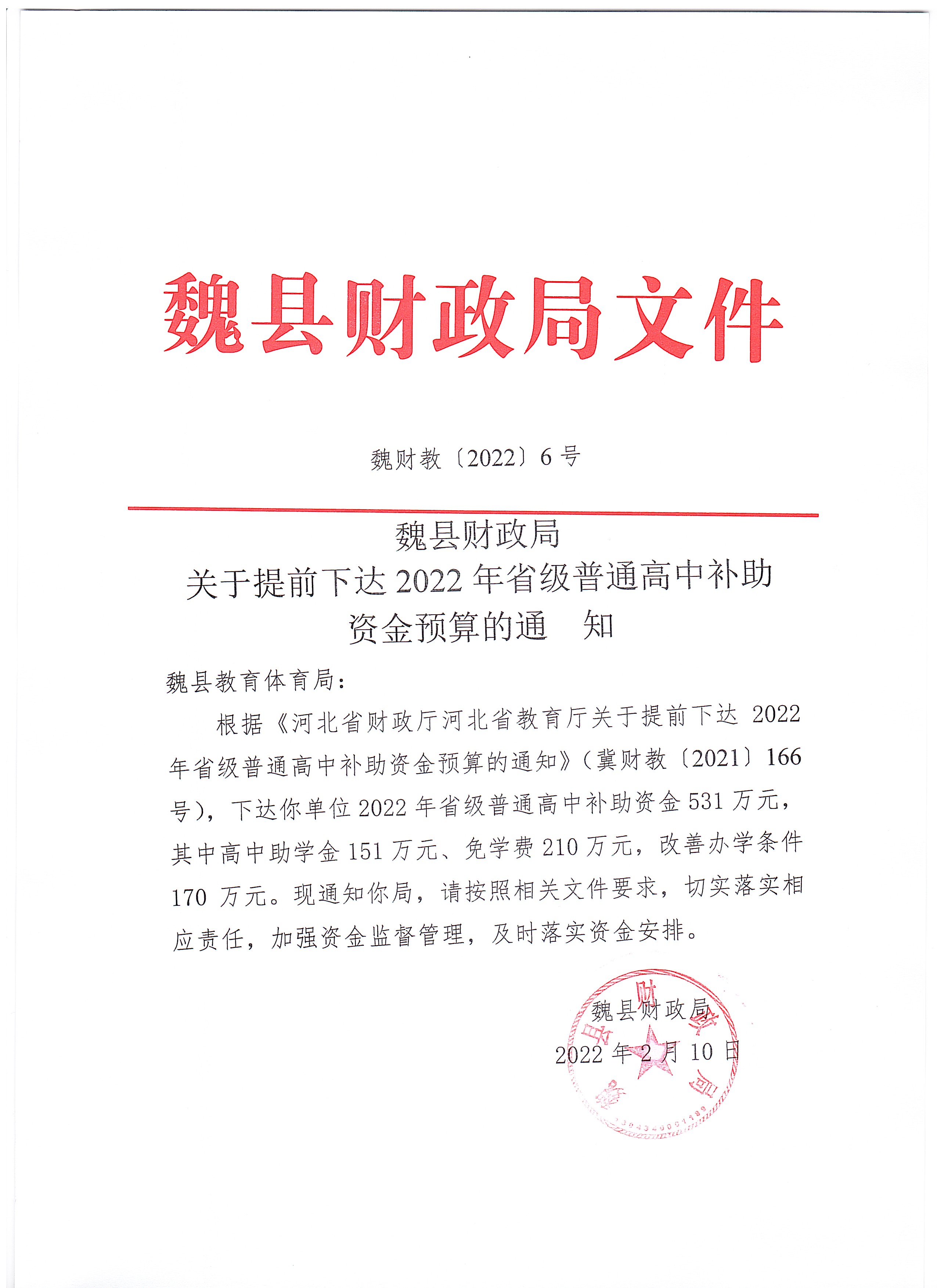 名稱:魏縣財(cái)政局關(guān)于提前下達(dá)2022年省級(jí)普通高中補(bǔ)助資金預(yù)算的通知