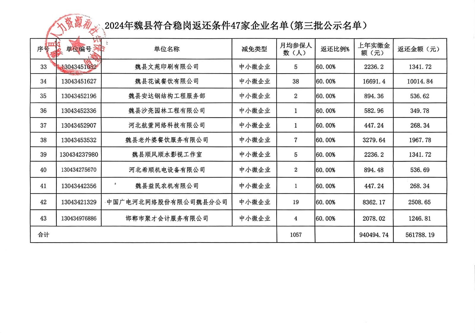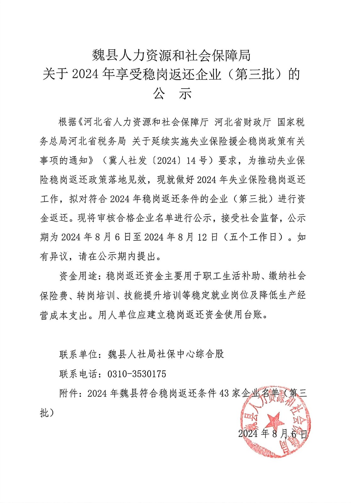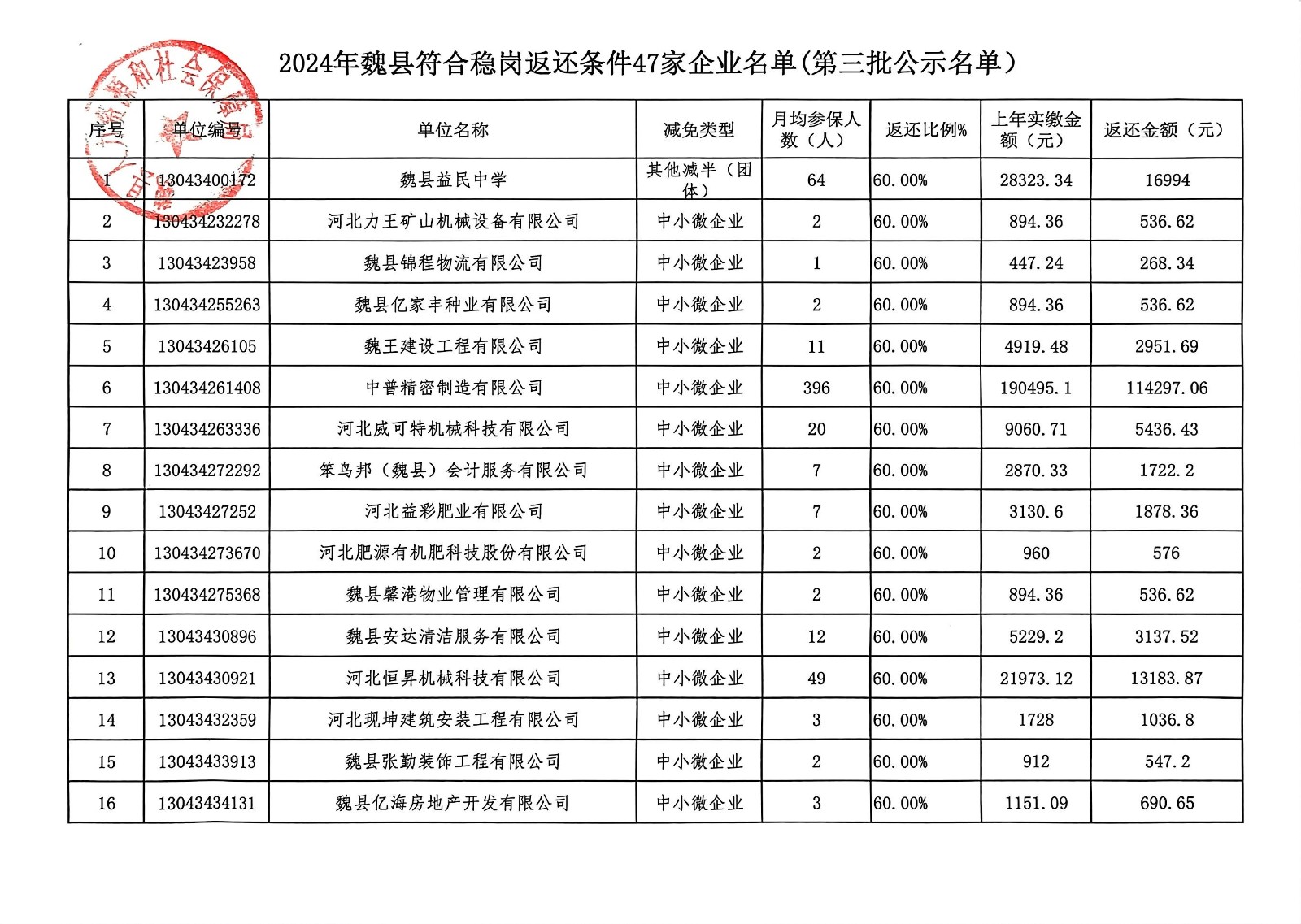 名稱:魏縣人力資源和社會(huì)保障局關(guān)于2024年享受穩(wěn)崗返還企業(yè)(第三批)的公示